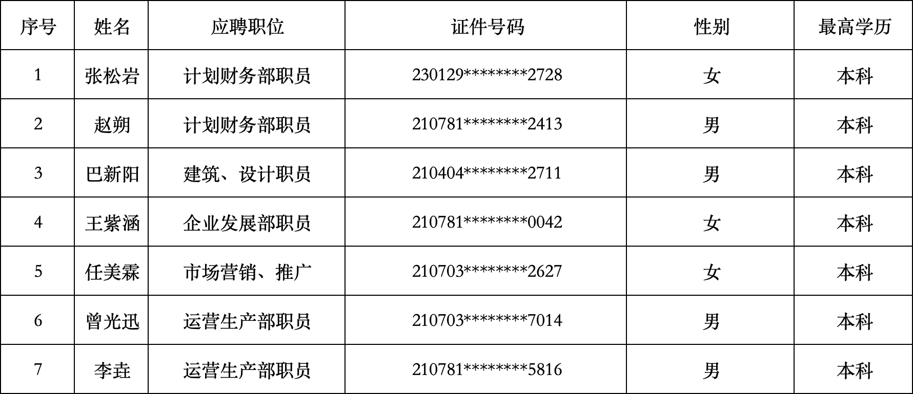按照《锦州海通实业有限公司2025年招聘公告》招聘工作的有关安排,经过笔试、面试、体检和考察等程序,确定以下7人为锦州海通实业有限公司拟录用员工,现予以公示。公示期间如有意见,请向锦州海通实业有限公司纪检监察部致电反映。